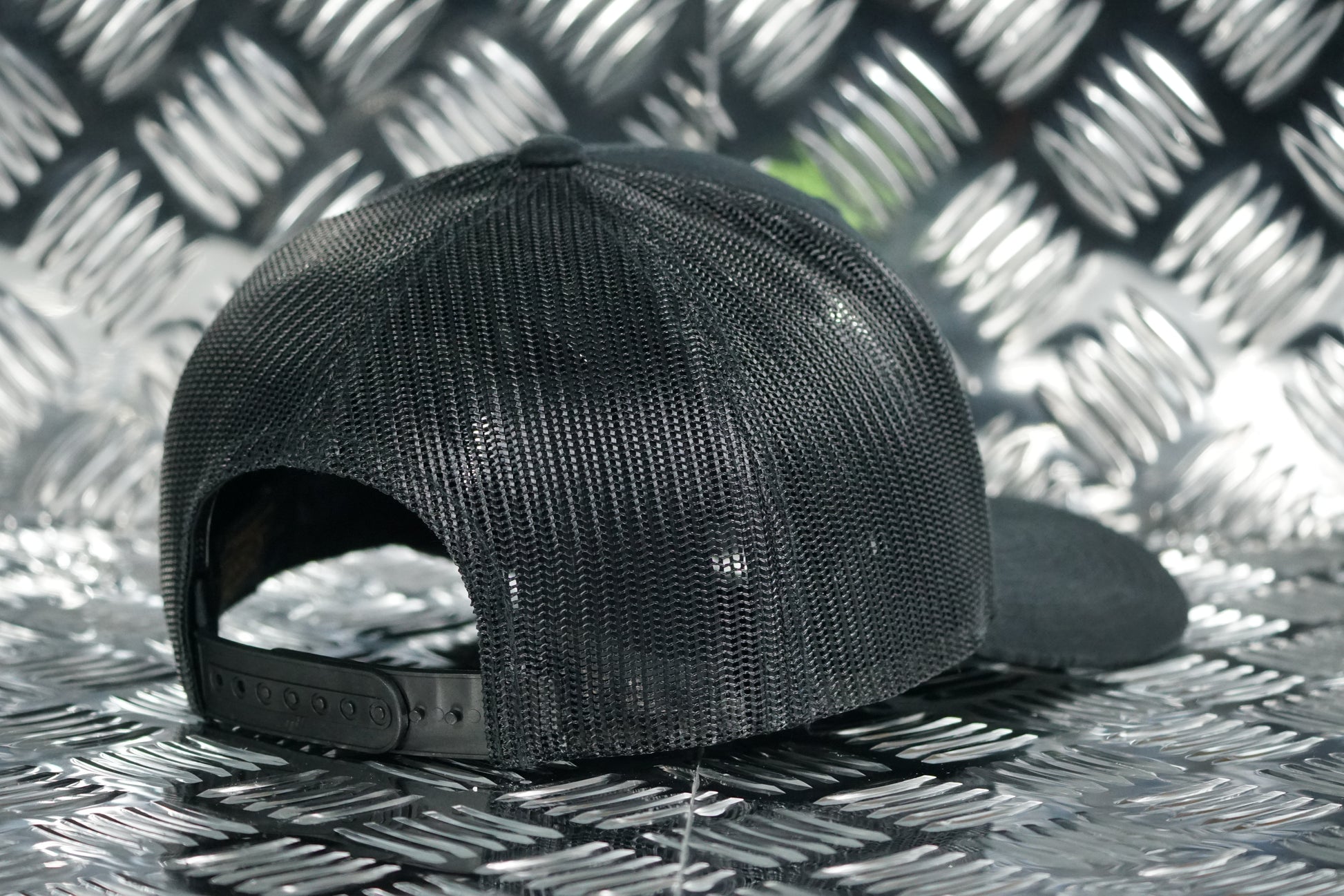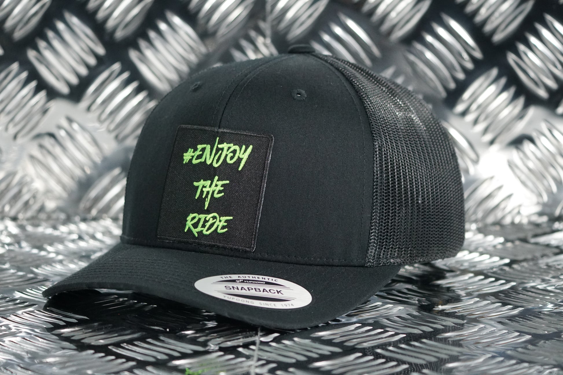 #EnjoyTheRide 6 Panel Retro Trucker Cap in Black with Fluorescent Green patchwork logo.