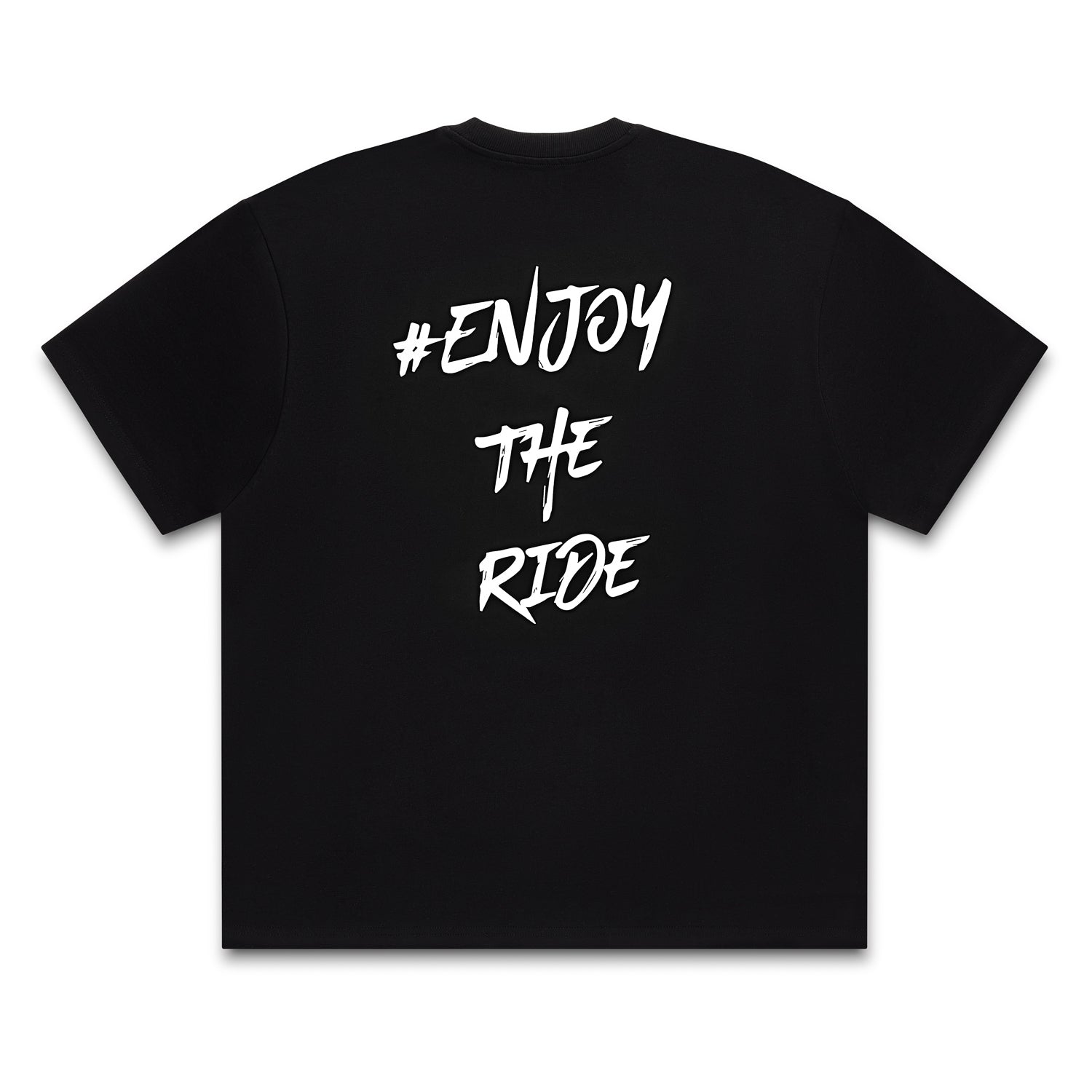 #EnjoyTheRide Black Unisex Heavyweight Oversize Short Sleeve T-Shirt with White #EnjoyTheRide logo on the rear.