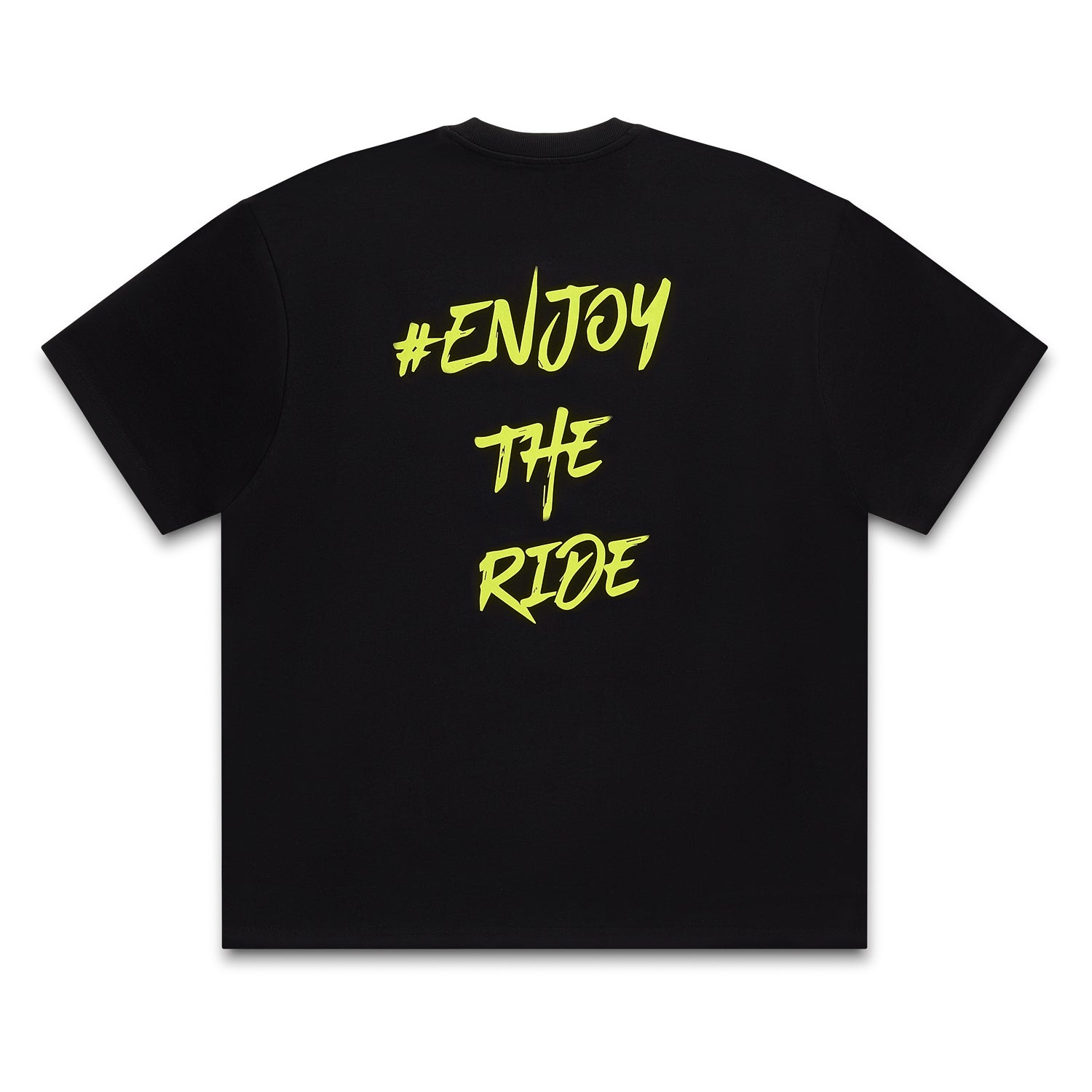 #EnjoyTheRide Black Unisex Heavyweight Oversize Short Sleeve T-Shirt with Yellow #EnjoyTheRide logo on the rear.